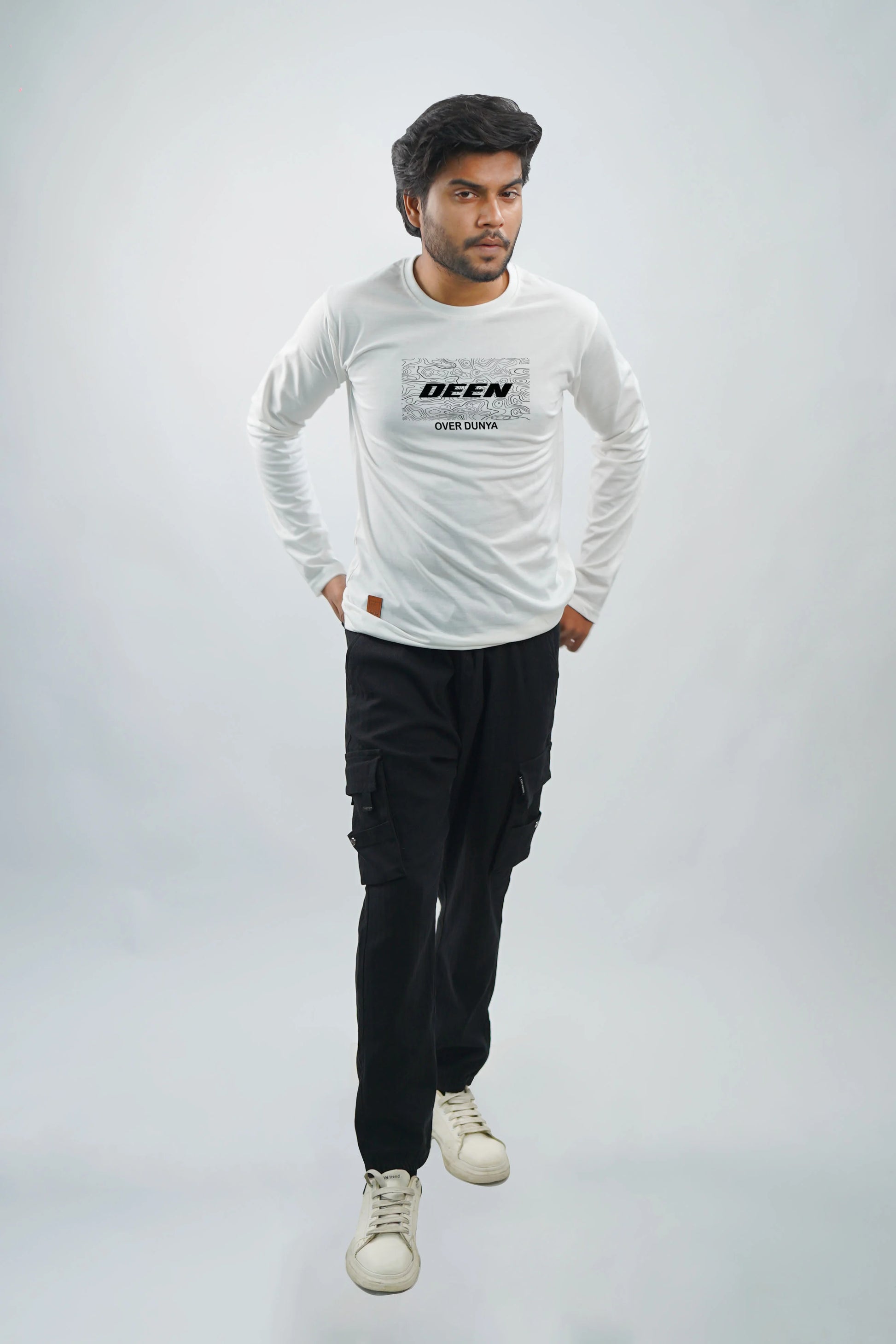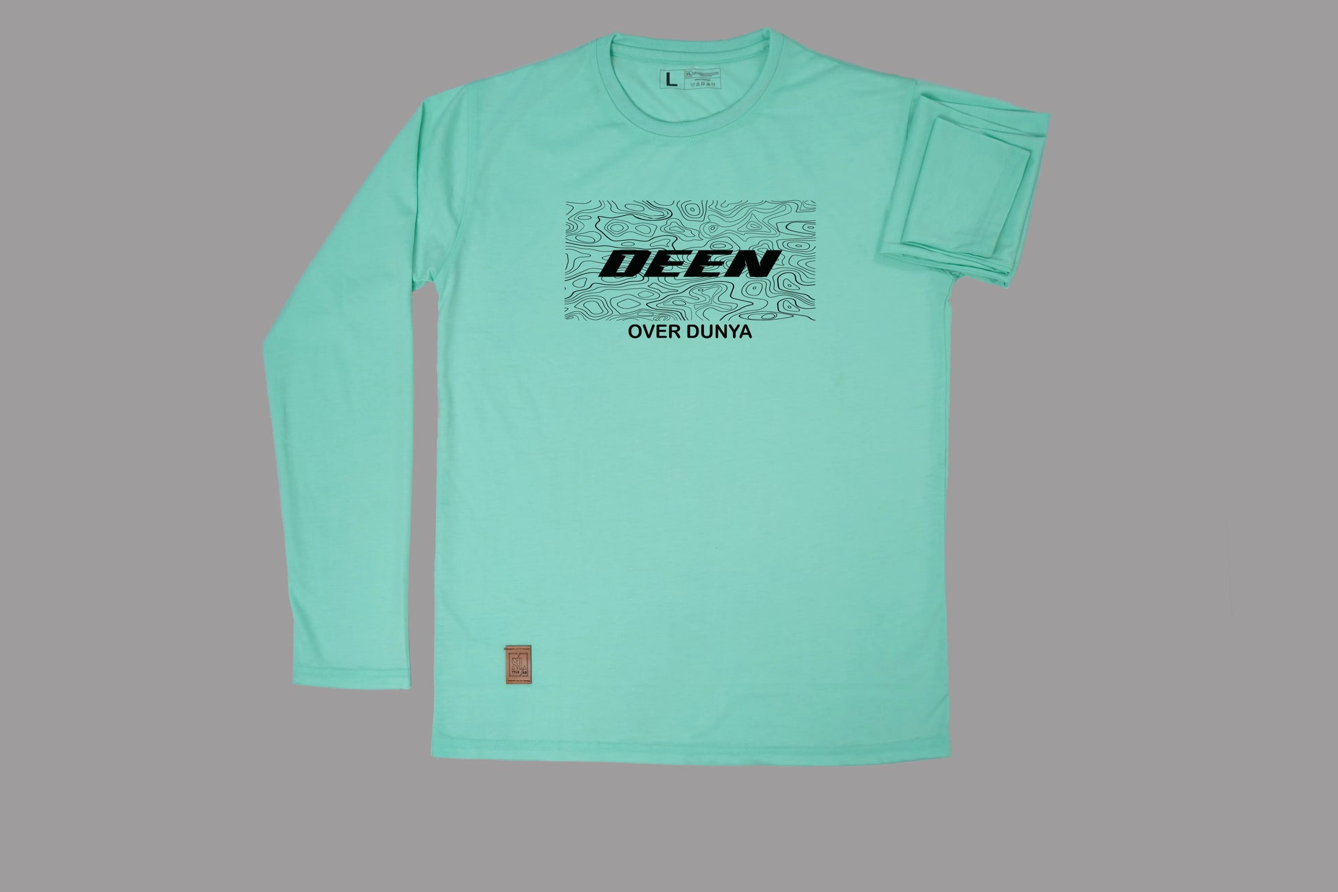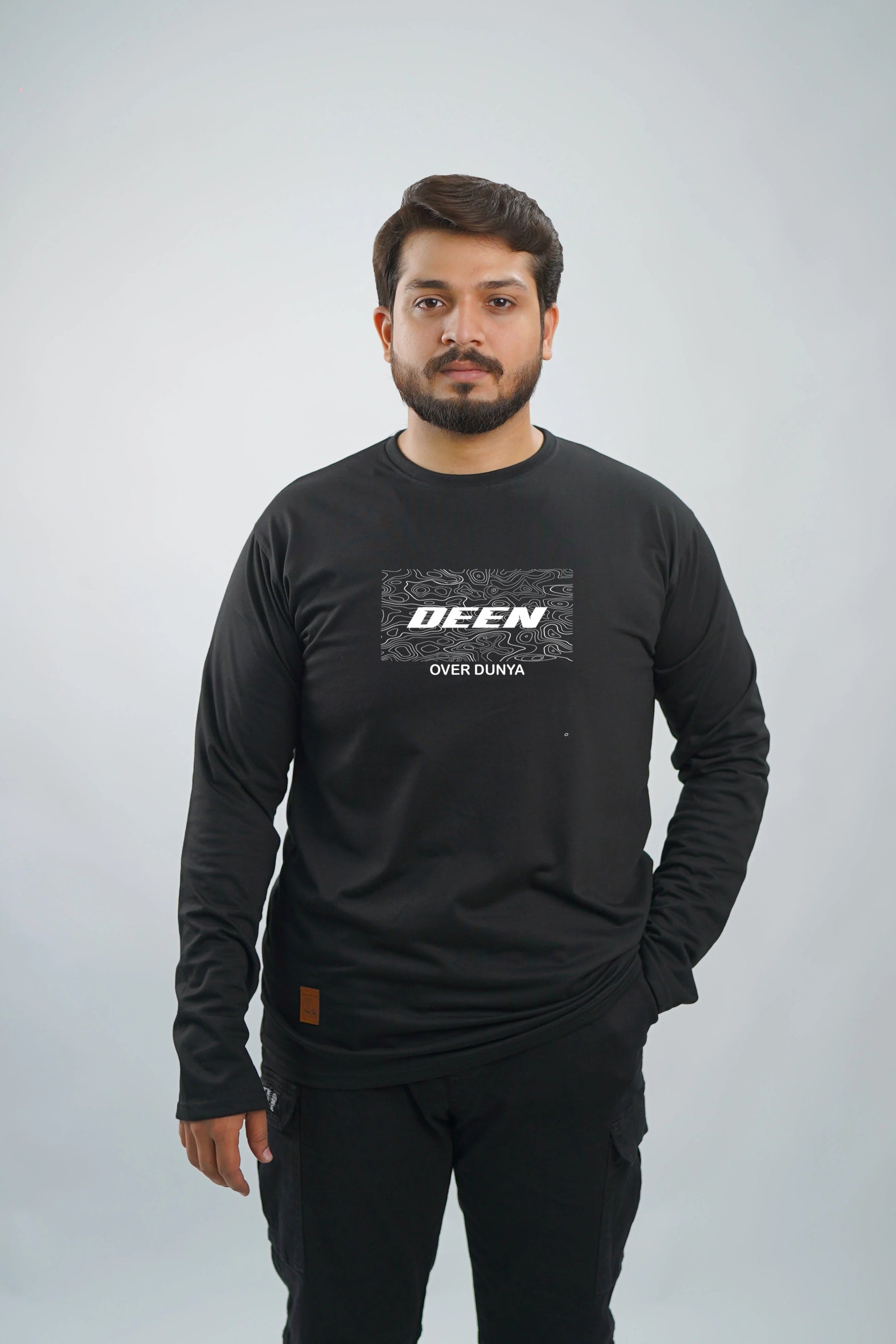 Stay grounded in your faith with the "Deen Over Dunya" full sleeve t-shirt—a bold reminder to prioritize what truly matters.